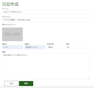 「追加」ボタンを押すことで、成長段階を入力できるフォームが生成するので、観察した日数分だけ追加することができます。